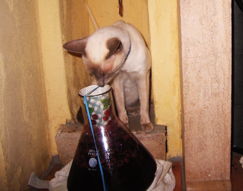 And here's a winery experiment, being evaluated by Talleyrand the cat. Hoping that some fabulous yeasts might be living right in our vineyard, we conducted a small test "natural" fermetation. Good thing for the Lallemand company in Montreal, Canada.